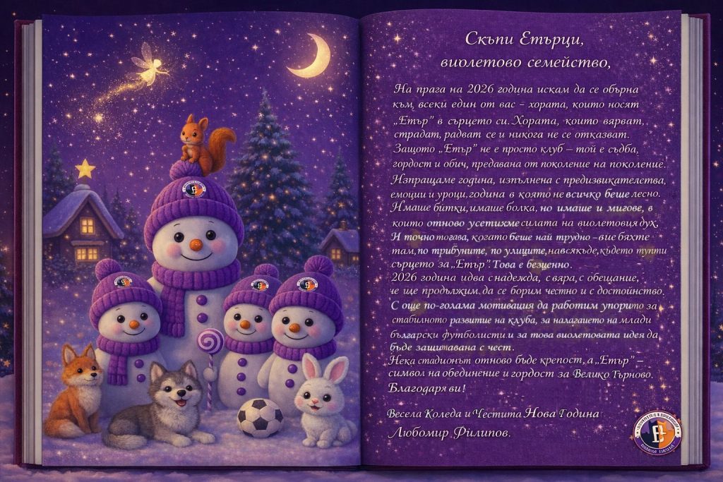 Скъпи Етърци, виолетово семейство, На прага на 2026 година искам да се обърна към всеки един от вас – хората, които носят „Етър“ в сърцето си. Хората, които вярват, страдат, радват се и никога не се отказват. Защото „Етър“ не е просто клуб – той е съдба, гордост и обич, предавана от поколение на поколение. […]