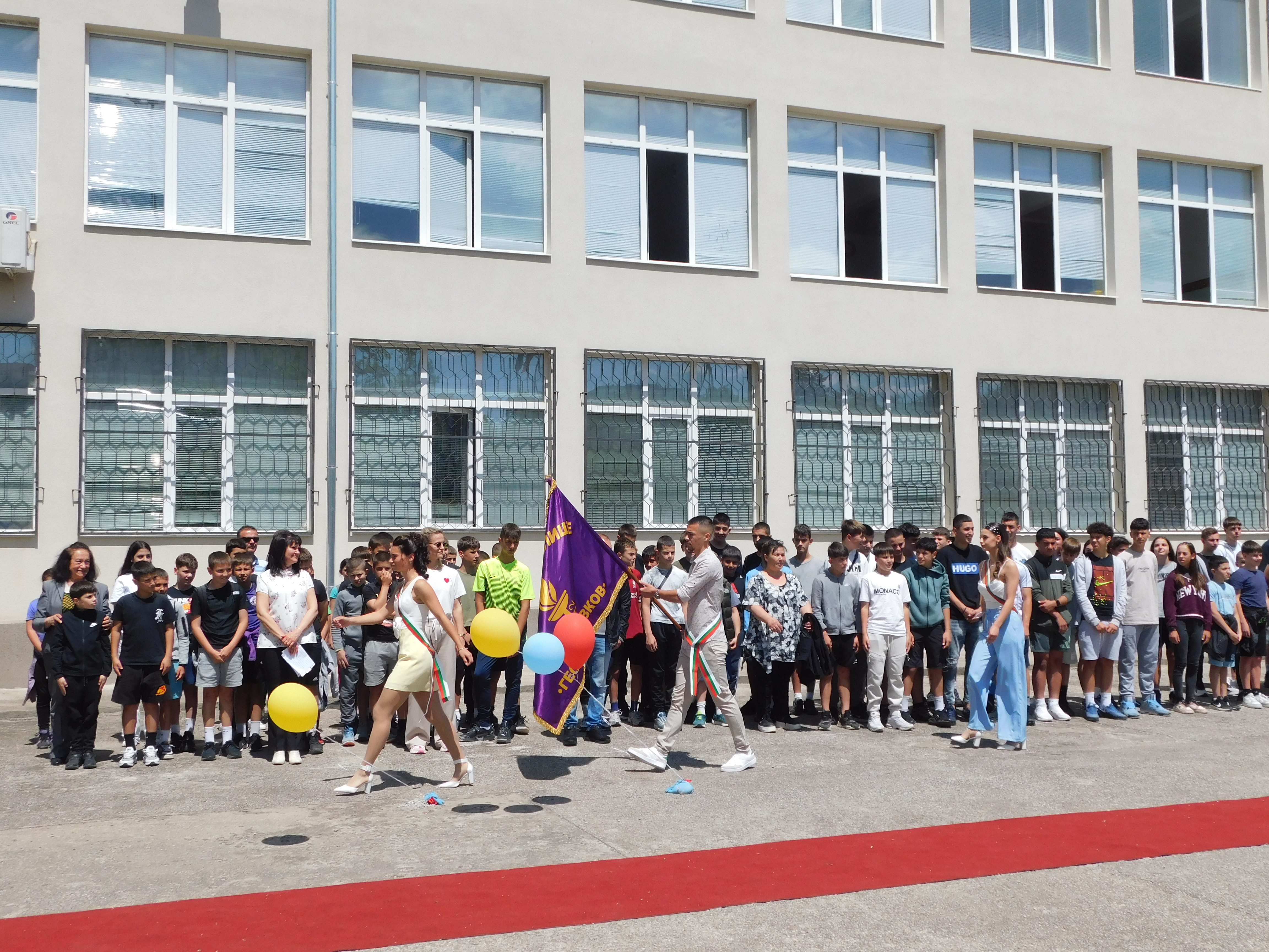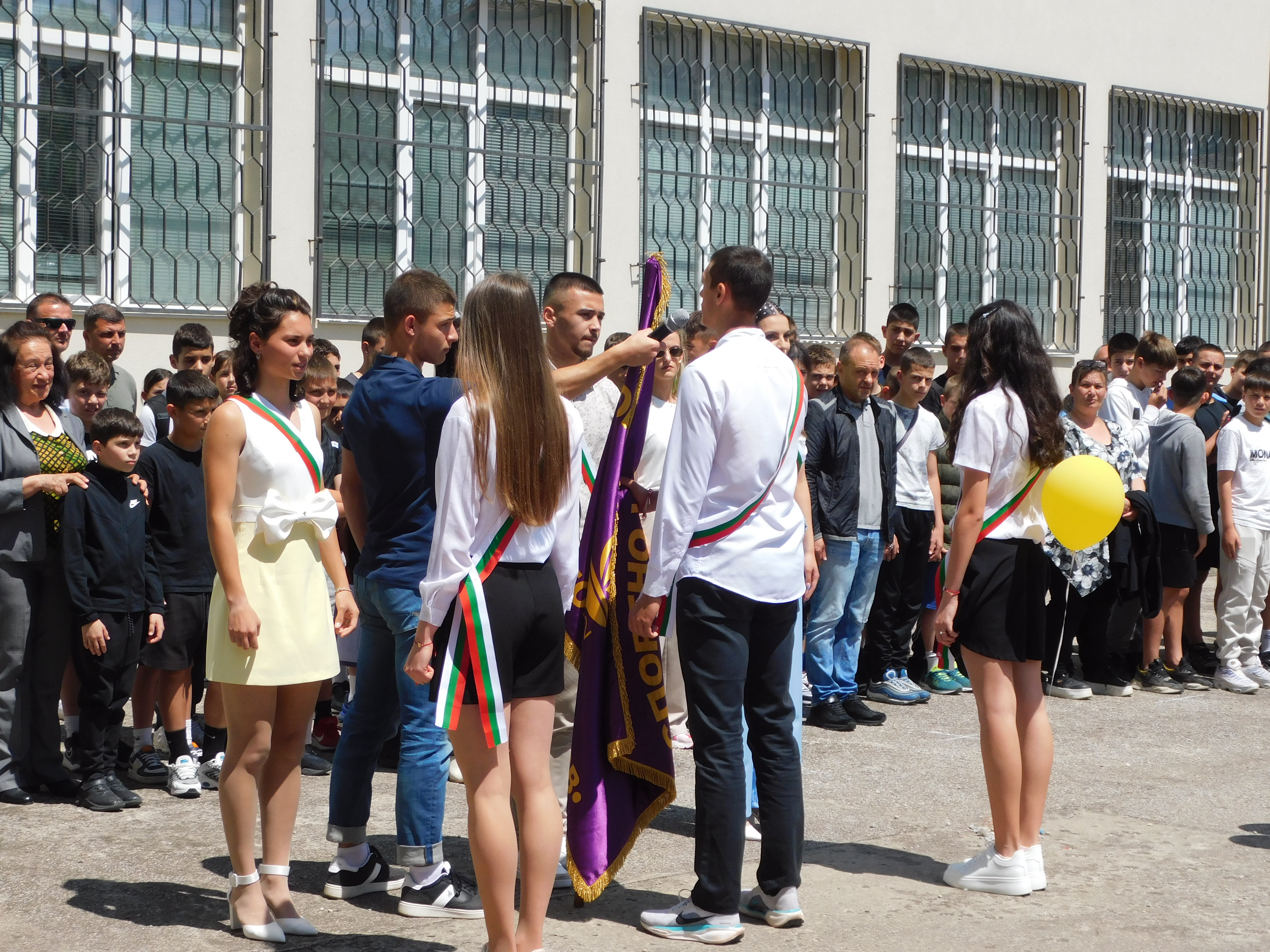 Изпращането започна с церемония за предаване на знамето на училището от дванайсетокласниците на следващите му знаменосци.