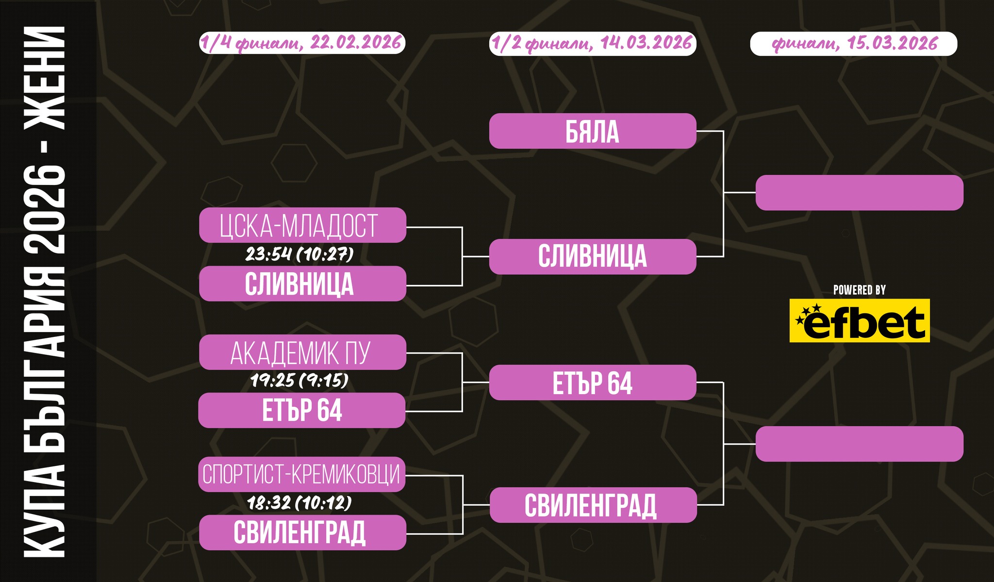 На полуфинала “Етър-64” ще срещне “Свиленград”, който се наложи като гост над “Спортист” (Кремиковци) с 32:18. В другия полуфинал “Бяла” ще срещне “Сливница”. Полуфиналите са на 14 март, а битката за отличието – на 15 март.