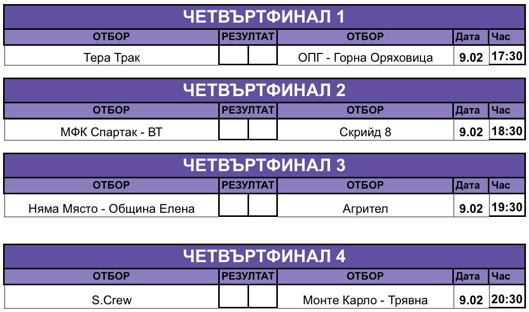 Четвъртфинални двойки и схема на Зимния турнир за Купата на кмета на Велико Търново: