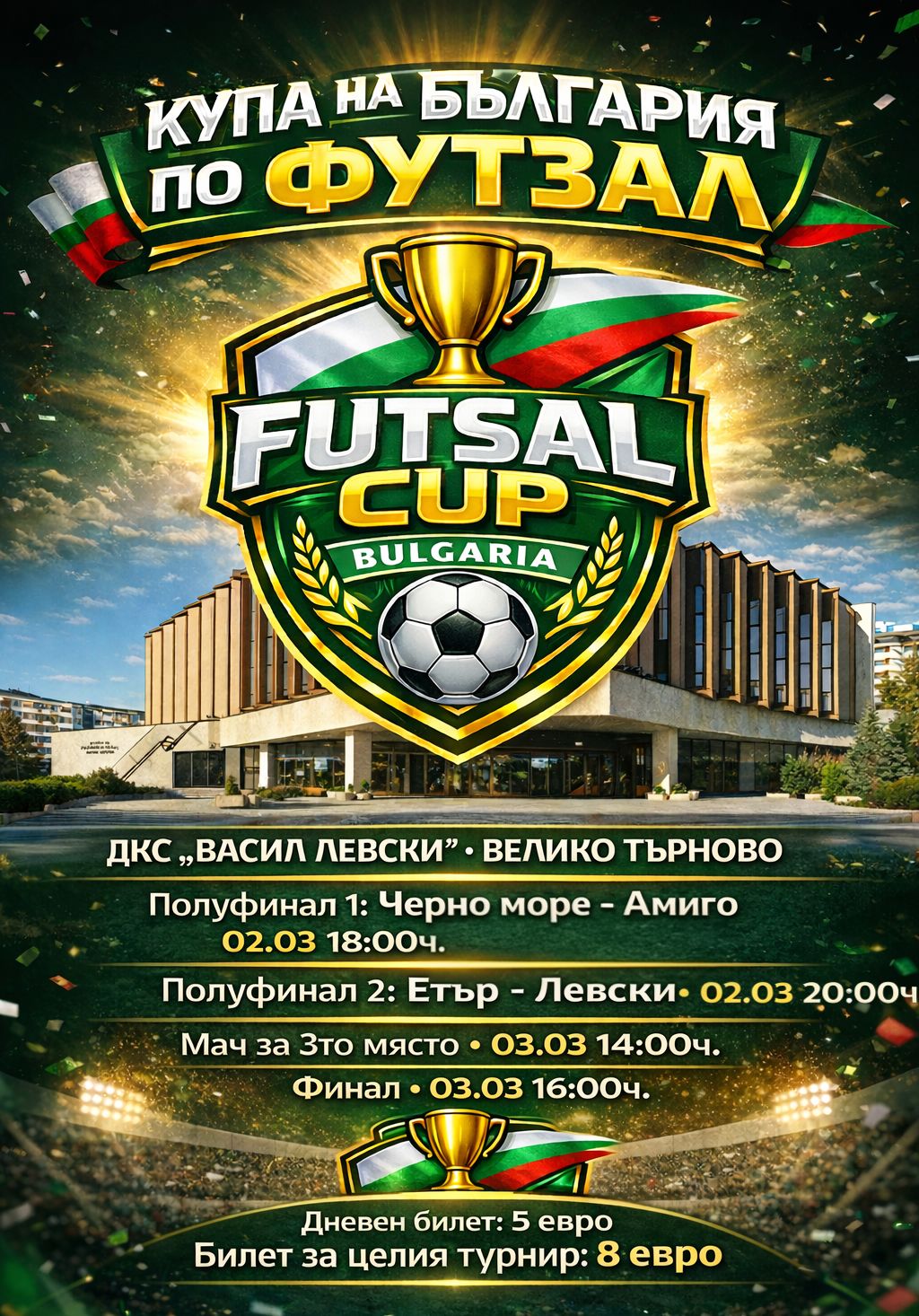 “Велико Търново става арена на финалите за Купата на България по футзал! В два дни – 2 и 3 март, най-добрите четири отбора ще се съберат, за да излъчат носителя на купата! Програмата предлага изключително интересни двубои, като ще започне със сблъсъка “Черно море” – “Амиго” на 02.03 от 18:00ч, а от 20:00 ние ще се изправим срещу отбора на “Левски” (София).