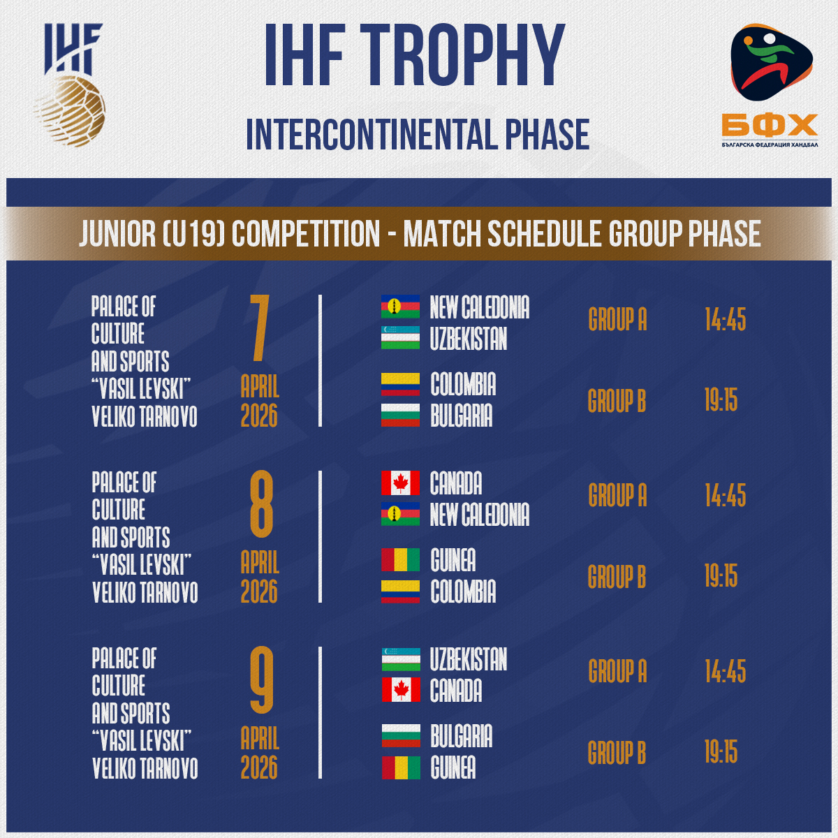Настъпи промяна в програмата на турнира на Международната федерация по хандбал IHF Trophy при девойките до 17 години, който ще се проведе през следващата седмица във Велико Търново, съобщиха от БФХ. От централата на IHF са уведомили, че интерконтиненталното издание на надпреварата ще се проведе без участието на отбора на Нова Каледония. Причината е усложнената геополитическа обстановка, която възпрепятства пристигането на тима. Въпреки това, страната ще се включи в турнира при девойките до 19 години.