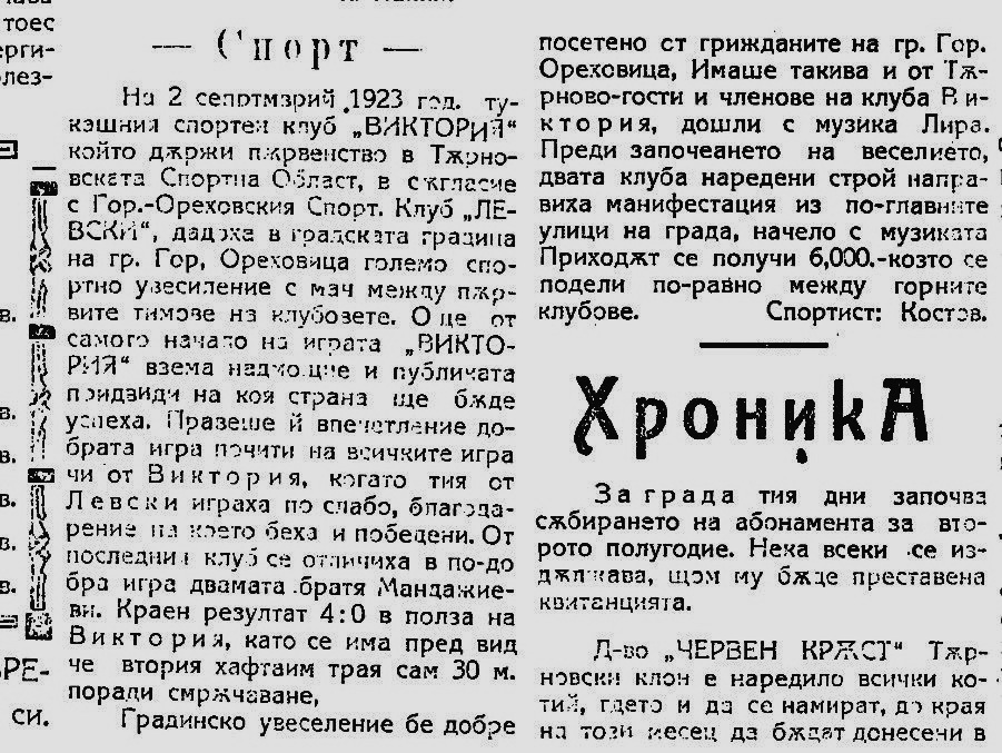 Тогавашният търновски вестник “Ново време” с подробности отразява събитието: “Тукашният спортен клуб “Виктория”, който държи първенство в Търновската спортна област, в съгласие с горнооряховския СК “Левски” дадоха в градската градина на Г. Оряховица голямо спортно увеселение с мач между първите отбори на клубовете.