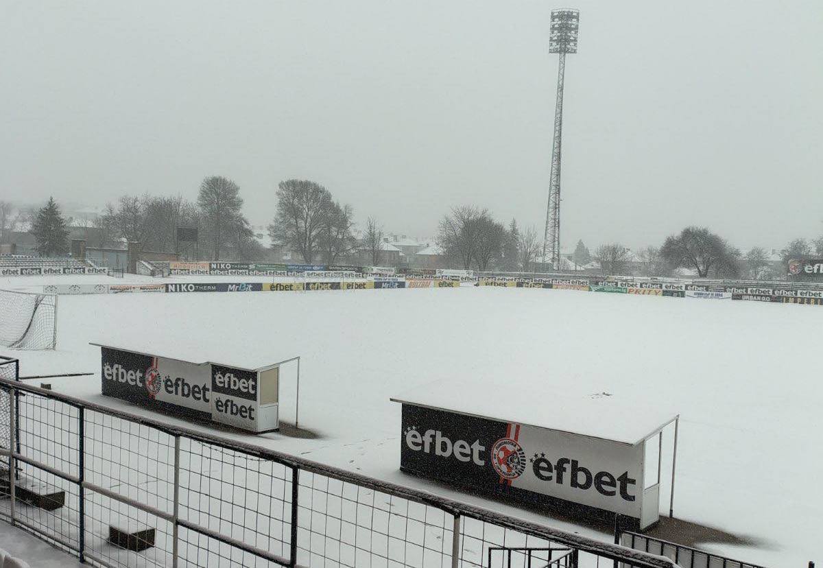 Обилният снеговалеж затрупа стадион “Локомотив” в Горна Жряховица преди днешното домакинство срещу “Пирин”, което трябва да е от 14:00 ч.