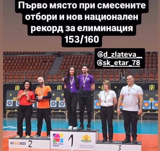 В смесен отбор с Александър Пагу в елиминациите победиха СК „Център“ (София), поставяйки нов национален рекорд с постигнатите 153 точки от 160, демонстрирайки стабилност, точност и спокойствие в решаващите моменти. Чавдар Чалъков и Памела Николова в дивизия гол лък също показаха добра форма и борбеност и в смесен отборспечелиха сребърни медали. Памела Николова зае четвърто място индивидуално, Чавдар Чалъков е шести в дивизия гол лък. В дивизия традиционен лък Мирослав Иванов е четвърти индивидуално, Николай Гайдаров е пети, а Тихомир Гайдаров – девети. Отборно се подредиха на трето място.